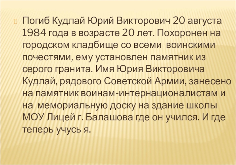 лет. Похоронен на городском кладбище со всеми воинскими почестями, ему установлен памятник из серого гранита. Имя Юрия Викторовича Кудлай, рядового Советской Армии, занесено на памятник воинам-интернационалистам и на мемориальную доску на здание школы МОУ Лицей г. Балашова где он учился. И где теперь учусь я.