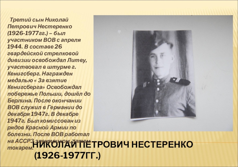 Третий сын Николай Петрович Нестеренко (1926-1977гг.) –
