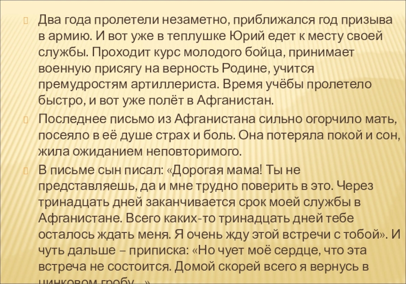 В письме сын писал: «Дорогая мама! Ты не представляешь, да и мне трудно поверить в это. Через тринадцать дней заканчивается срок моей службы в Афганистане. Всего каких-то тринадцать дней тебе осталось ждать меня. Я очень жду этой встречи с тобой». И чуть дальше – приписка: «Но чует моё сердце, что эта встреча не состоится. Домой скорей всего я вернусь в цинковом гробу…»
