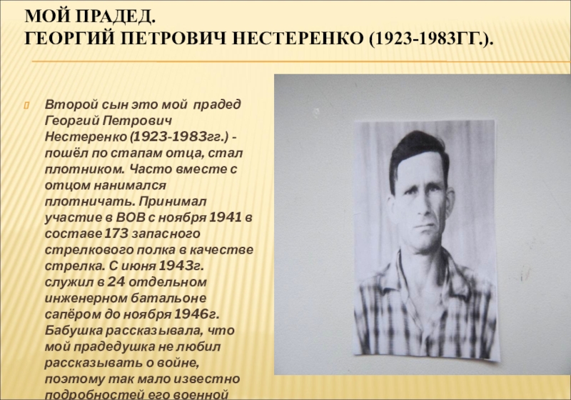 Георгий Петрович Нестеренко (1923-1983гг.) - пошёл по стапам отца, стал плотником. Часто вместе с отцом нанимался плотничать. Принимал участие в ВОВ с ноября 1941 в составе 173 запасного стрелкового полка в качестве стрелка. С июня 1943г. служил в 24 отдельном инженерном батальоне сапёром до ноября 1946г. Бабушка рассказывала, что мой прадедушка не любил рассказывать о войне, поэтому так мало известно подробностей его военной биографии.