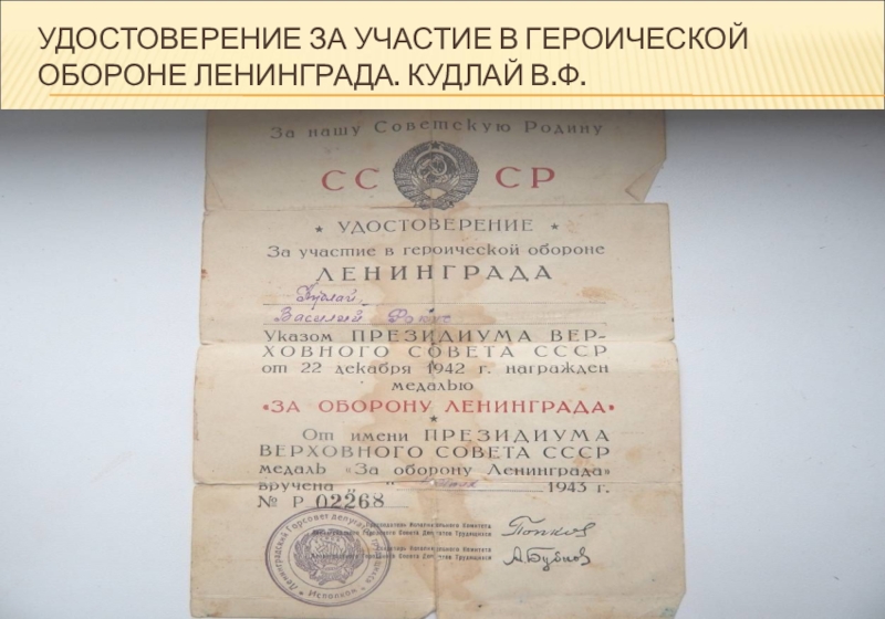 Слайд 38УДОСТОВЕРЕНИЕ ЗА УЧАСТИЕ В ГЕРОИЧЕСКОЙ ОБОРОНЕ ЛЕНИНГРАДА. КУДЛАЙ В.Ф.