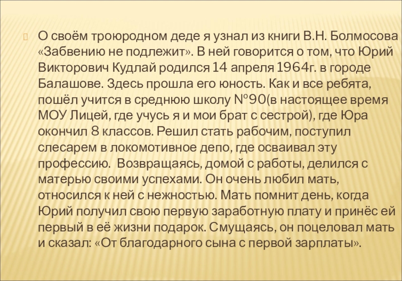 не подлежит». В ней говорится о том, что Юрий Викторович Кудлай родился 14 апреля 1964г. в городе Балашове. Здесь прошла его юность. Как и все ребята, пошёл учится в среднюю школу №90(в настоящее время МОУ Лицей, где учусь я и мои брат с сестрой), где Юра окончил 8 классов. Решил стать рабочим, поступил слесарем в локомотивное депо, где осваивал эту профессию. Возвращаясь, домой с работы, делился с матерью своими успехами. Он очень любил мать, относился к ней с нежностью. Мать помнит день, когда Юрий получил свою первую заработную плату и принёс ей первый в её жизни подарок. Смущаясь, он поцеловал мать и сказал: «От благодарного сына с первой зарплаты».