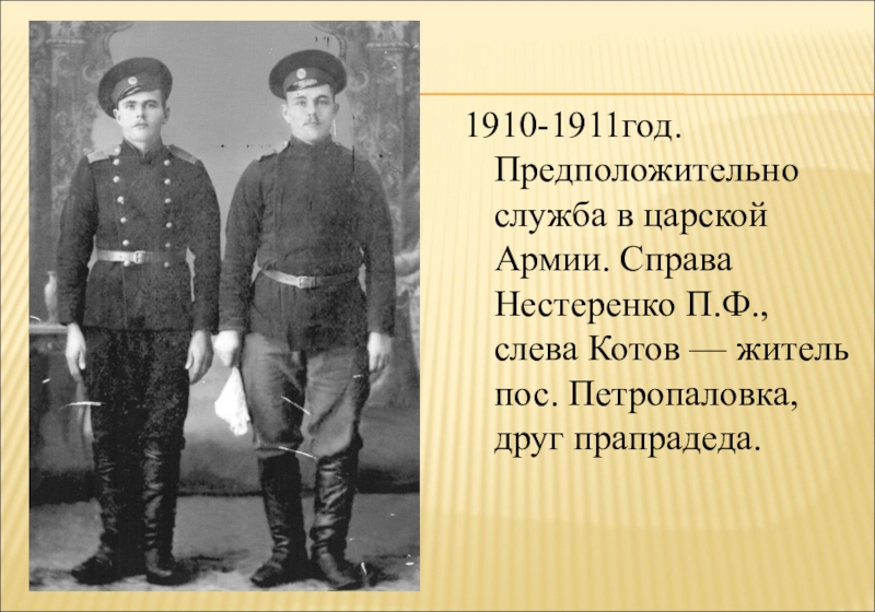 1910-1911год. Предположительно служба в царской Армии. Справа Нестеренко П.Ф., слева Котов