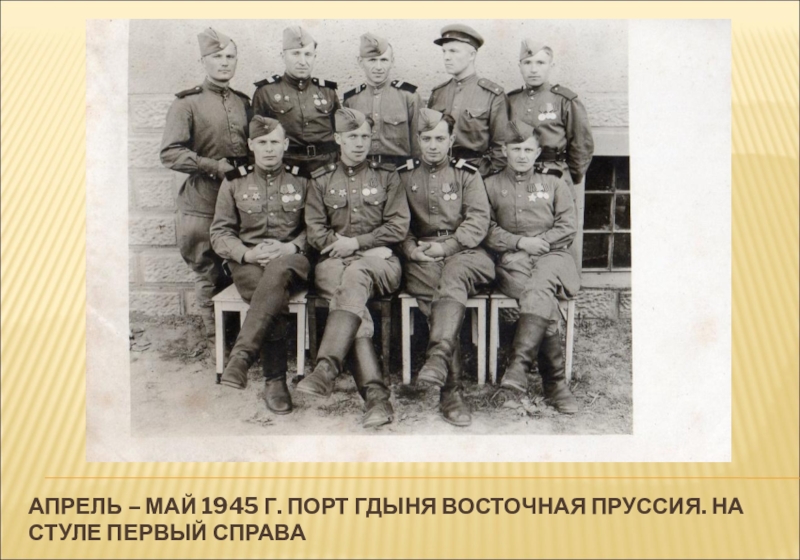 Слайд 21АПРЕЛЬ – МАЙ 1945 Г. ПОРТ ГДЫНЯ ВОСТОЧНАЯ ПРУССИЯ. НА СТУЛЕ