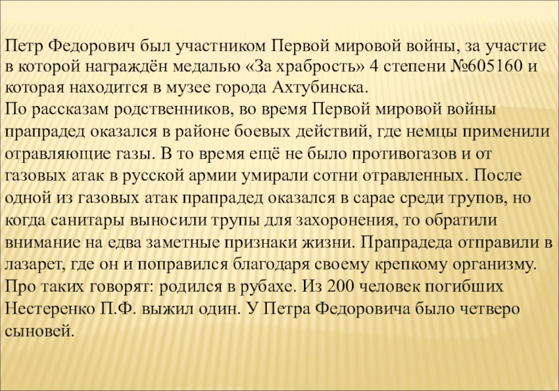По рассказам родственников, во время Первой мировой войны прапрадед оказался в районе боевых действий, где немцы применили отравляющие газы. В то время ещё не было противогазов и от газовых атак в русской армии умирали сотни отравленных. После одной из газовых атак прапрадед оказался в сарае среди трупов, но когда санитары выносили трупы для захоронения, то обратили внимание на едва заметные признаки жизни. Прапрадеда отправили в лазарет, где он и поправился благодаря своему крепкому организму. Про таких говорят: родился в рубахе. Из 200 человек погибших Нестеренко П.Ф. выжил один. У Петра Федоровича было четверо сыновей.