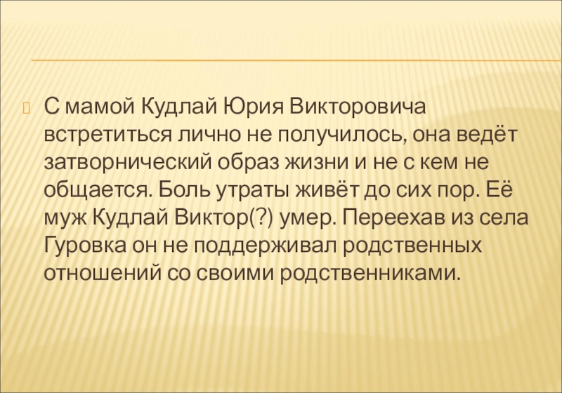 затворнический образ жизни и не с кем не общается. Боль утраты живёт до сих пор. Её муж Кудлай Виктор(?) умер. Переехав из села Гуровка он не поддерживал родственных отношений со своими родственниками.