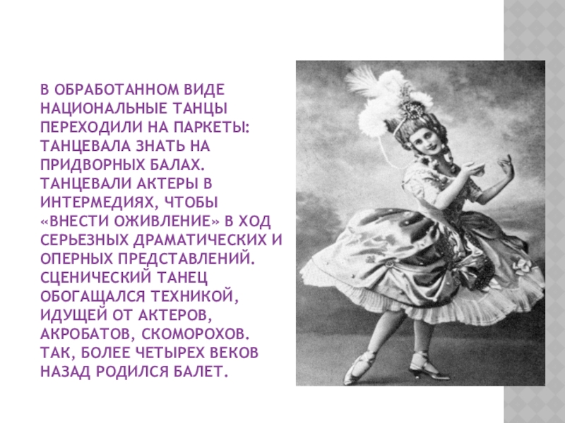 придворных балах. Танцевали актеры в интермедиях, чтобы «внести оживление» в ход серьезных драматических и оперных представлений. Сценический танец обогащался техникой, идущей от актеров, акробатов, скоморохов. Так, более четырех веков назад родился балет.
