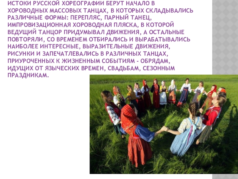 Слайд 9Истоки русской хореографии берут начало в хороводных массовых танцах, в которых