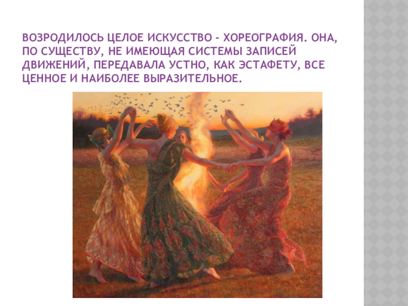 Слайд 6Возродилось целое искусство - хореография. Она, по существу, не имеющая системы