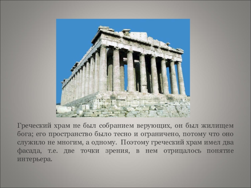 Слайд 11Греческий храм не был собранием верующих, он был жилищем бога; его