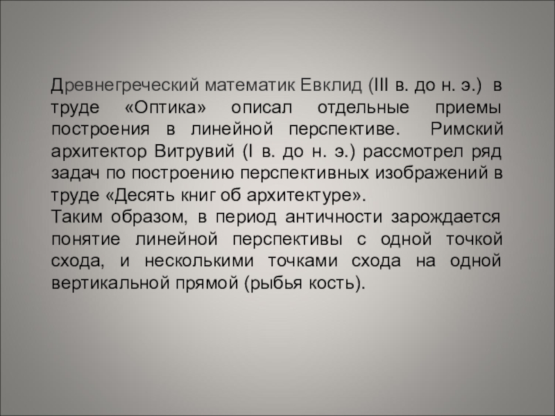 описал отдельные приемы построения в линейной перспективе. Римский архитектор Витрувий (I в. до н. э.) рассмотрел ряд задач по построению перспективных изображений в труде «Десять книг об архитектуре».
