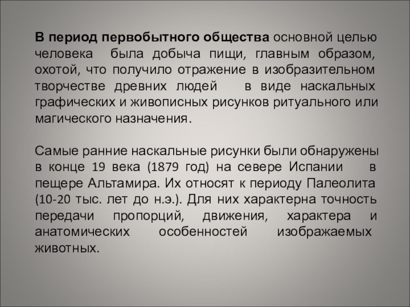 образом, охотой, что получило отражение в изобразительном творчестве древних людей в виде наскальных графических и живописных рисунков ритуального или магического назначения.