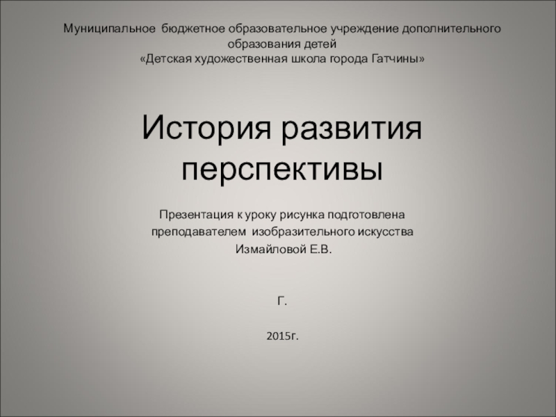 мнение, что создателем прямой линейной перспективы, когда точка схода находится в картинной плоскости, был итальянский архитектор Филиппо Брунелески. Перспектива эпохи Возрождения умозрительна. Но она позволяет реалистично изображать конкретный эпизод окружающего мира.