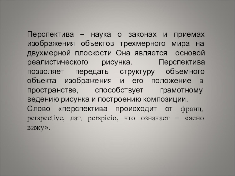Слово «перспектива происходит от франц. perspective, лат. perspicio, что означает – «ясно вижу».