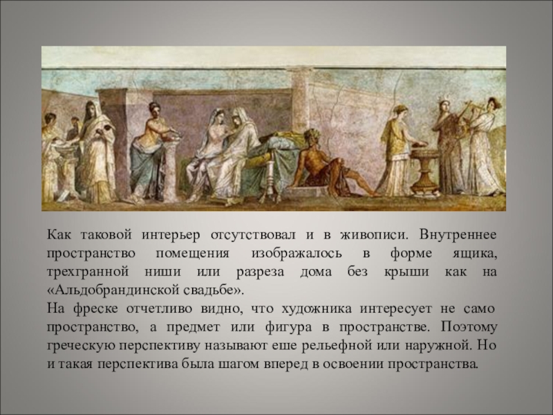 На фреске отчетливо видно, что художника интересует не само пространство, а предмет или фигура в пространстве. Поэтому греческую перспективу называют еше рельефной или наружной. Но и такая перспектива была шагом вперед в освоении пространства.