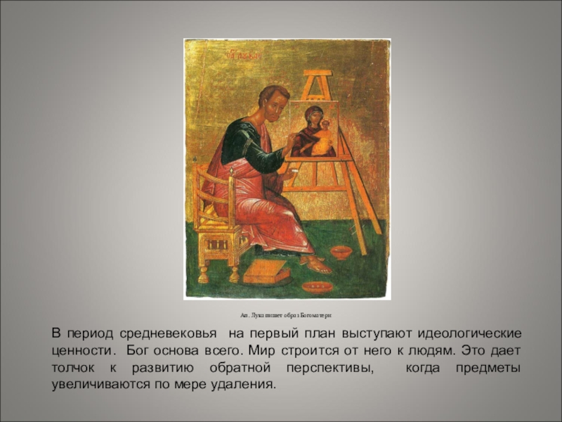 период средневековья на первый план выступают идеологические ценности. Бог основа всего. Мир строится от него к людям. Это дает толчок к развитию обратной перспективы, когда предметы увеличиваются по мере удаления.