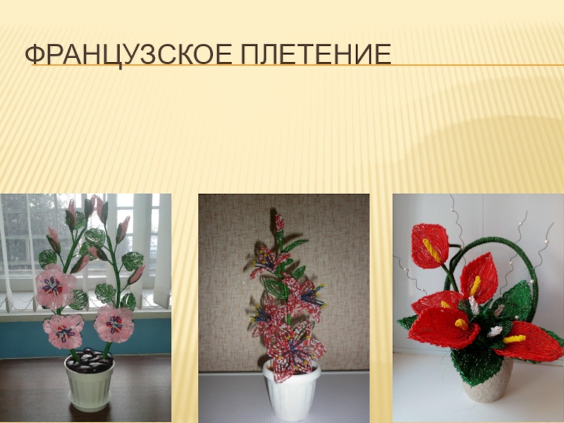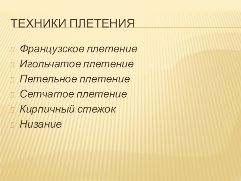 Техники плетенияФранцузское плетениеИгольчатое плетениеПетельное плетениеСетчатое плетениеКирпичный стежокНизание