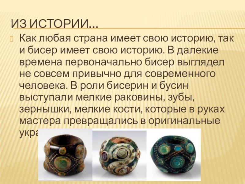 свою историю. В далекие времена первоначально бисер выглядел не совсем привычно для современного человека. В роли бисерин и бусин выступали мелкие раковины, зубы, зернышки, мелкие кости, которые в руках мастера превращались в оригинальные украшения.