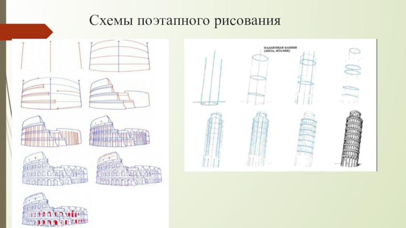 Цели: 1. Обучающая: Научить детей компоновке изображения на листе. Построению перспективы в открытом и архитектурном пространстве, соблюдая верные пропорции. Рисование объектов геометрического и линейного характера с применением линий симметрии. 2. Развивающая: Развивать творческие способности и задатки, способность выделять главное, умение обобщать. Развивать аккуратность и внимание. 3. Воспитывающая: Воспитывать интерес к мировой художественной культуре и истории мирового искусства, художественный вкус, творчески активную личность. Материалы: Бумага, простой карандаш, линейка, ластик, цветные карандаши, пастель.