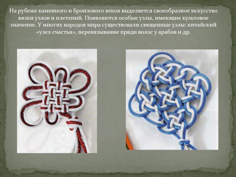 узлов и плетений. Появляются особые узлы, имеющие культовое значение. У многих народов мира существовали священные узлы: китайский «узел счастья», перевязывание пряди волос у арабов и др.