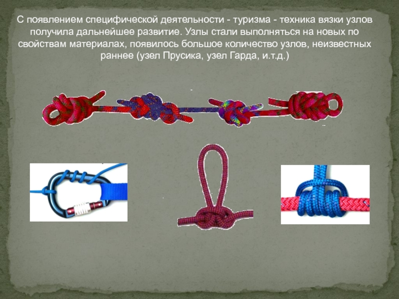 Слайд 13С появлением специфической деятельности - туризма - техника вязки узлов получила
