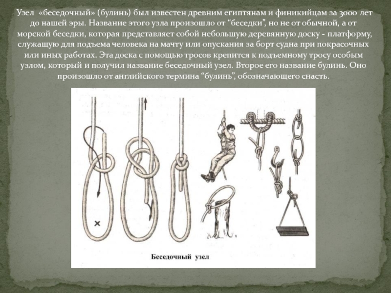 лет до нашей эры. Название этого узла произошло от “беседки”, но не от обычной, а от морской беседки, которая представляет собой небольшую деревянную доску - платформу, служащую для подъема человека на мачту или опускания за борт судна при покрасочных или иных работах. Эта доска с помощью тросов крепится к подъемному тросу особым узлом, который и получил название беседочный узел. Второе его название булинь. Оно произошло от английского термина “булинь”, обозначающего снасть.