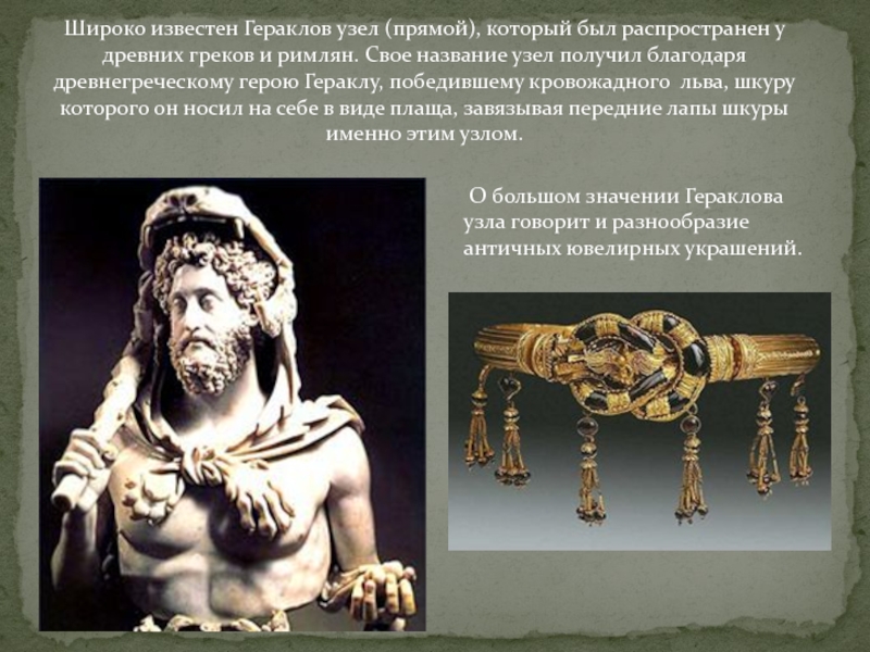 и римлян. Свое название узел получил благодаря древнегреческому герою Гераклу, победившему кровожадного льва, шкуру которого он носил на себе в виде плаща, завязывая передние лапы шкуры именно этим узлом.