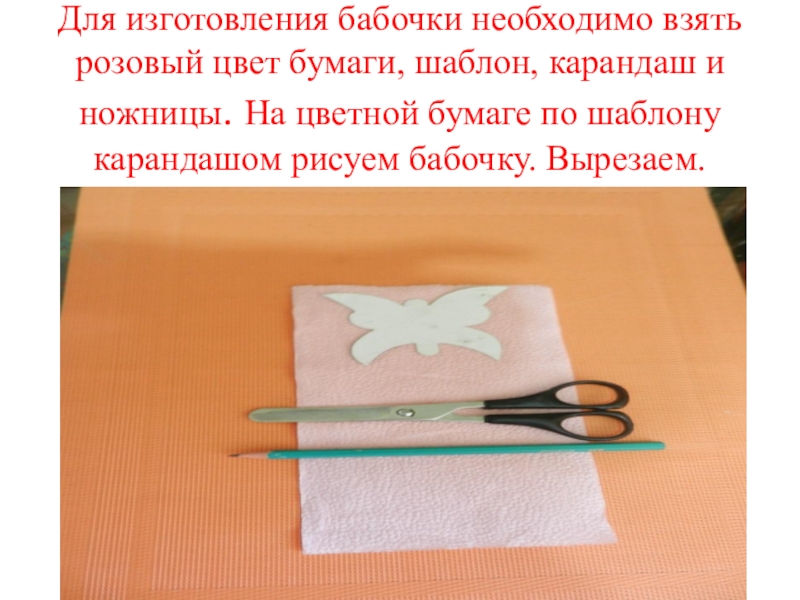 Слайд 19Для изготовления бабочки необходимо взять розовый цвет бумаги, шаблон, карандаш и
