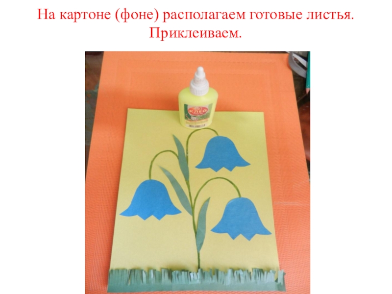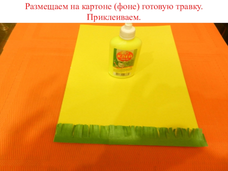 Слайд 6Размещаем на картоне (фоне) готовую травку. Приклеиваем.