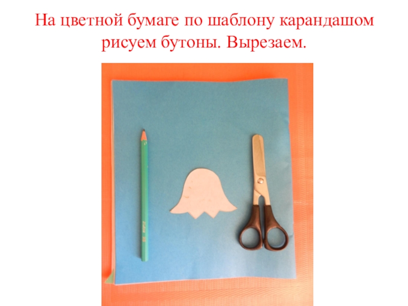 Слайд 9На цветной бумаге по шаблону карандашом рисуем бутоны. Вырезаем.