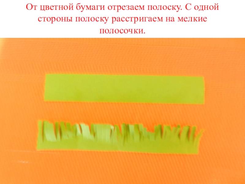 Слайд 5От цветной бумаги отрезаем полоску. С одной стороны полоску расстригаем на