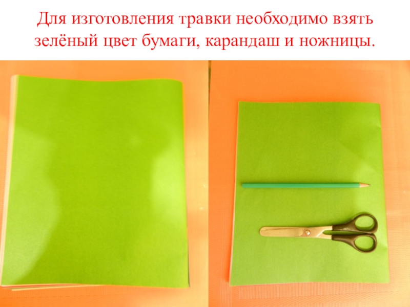 Слайд 4Для изготовления травки необходимо взять зелёный цвет бумаги, карандаш и ножницы.