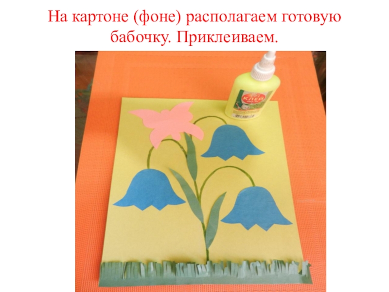 Слайд 21На картоне (фоне) располагаем готовую бабочку. Приклеиваем.