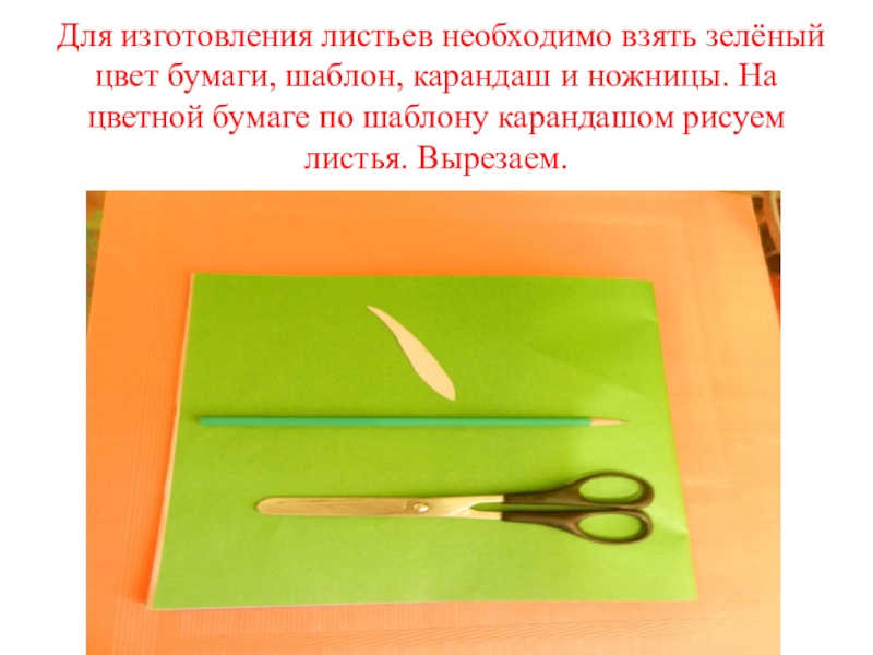 Слайд 16Для изготовления листьев необходимо взять зелёный цвет бумаги, шаблон, карандаш и