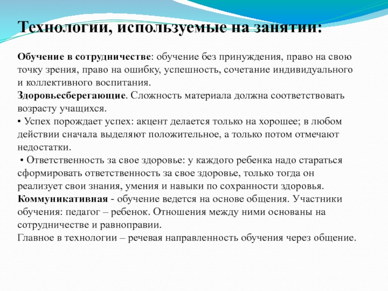 Коммуникативная - обучение ведется на основе общения. Участники обучения: педагог – ребенок. Отношения между ними основаны на сотрудничестве и равноправии.