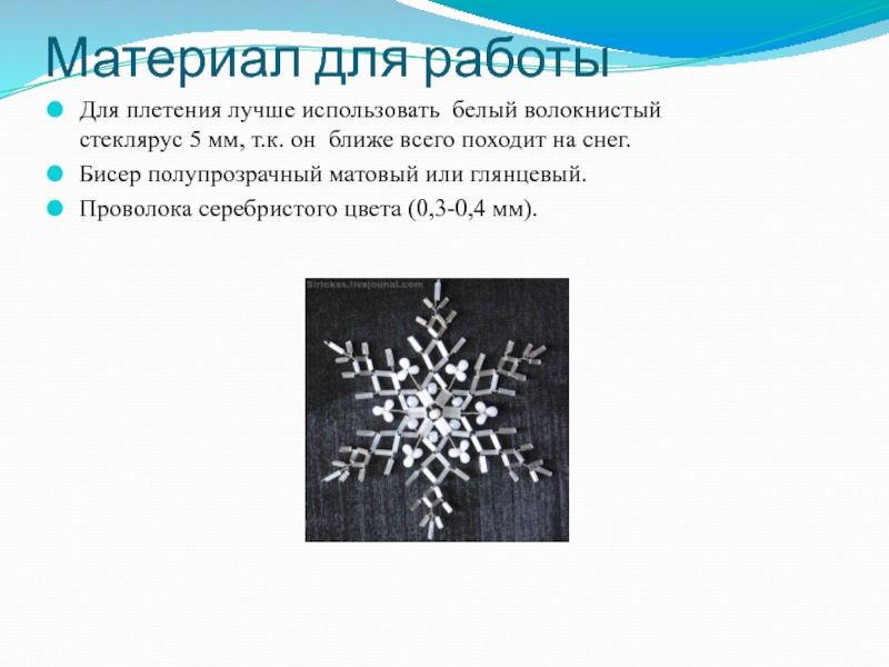 Материал для работыДля плетения лучше использовать белый волокнистый стеклярус 5 мм, т.к. он ближе всего походит на