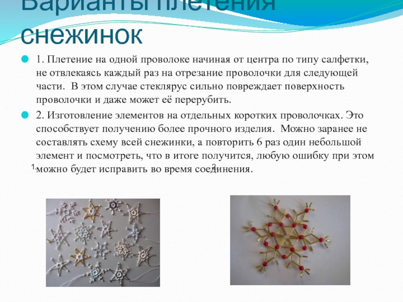 Варианты плетения снежинок1. Плетение на одной проволоке начиная от центра по типу салфетки, не отвлекаясь каждый раз