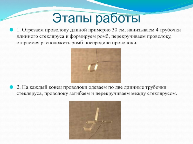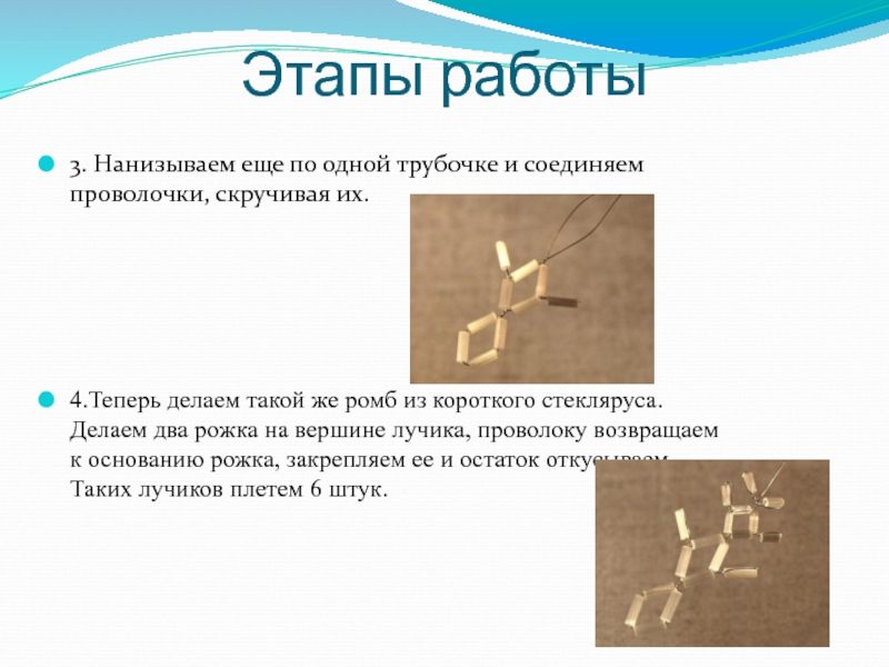 Этапы работы3. Нанизываем еще по одной трубочке и соединяем проволочки, скручивая их.4.Теперь делаем такой же ромб из