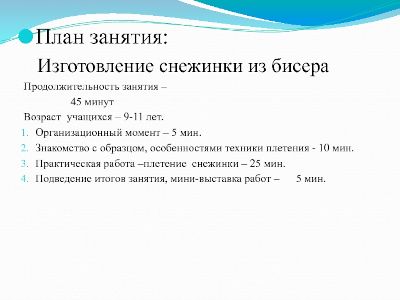 План занятия: Изготовление снежинки из бисераПродолжительность занятия – 45 минутВозраст учащихся – 9-11 лет.Организационный момент – 5 мин.Знакомство с образцом, особенностями техники плетения - 10