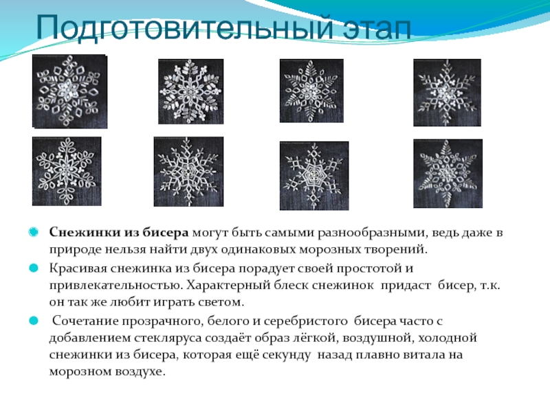 Подготовительный этапСнежинки из бисера могут быть самыми разнообразными, ведь даже в природе нельзя найти двух одинаковых