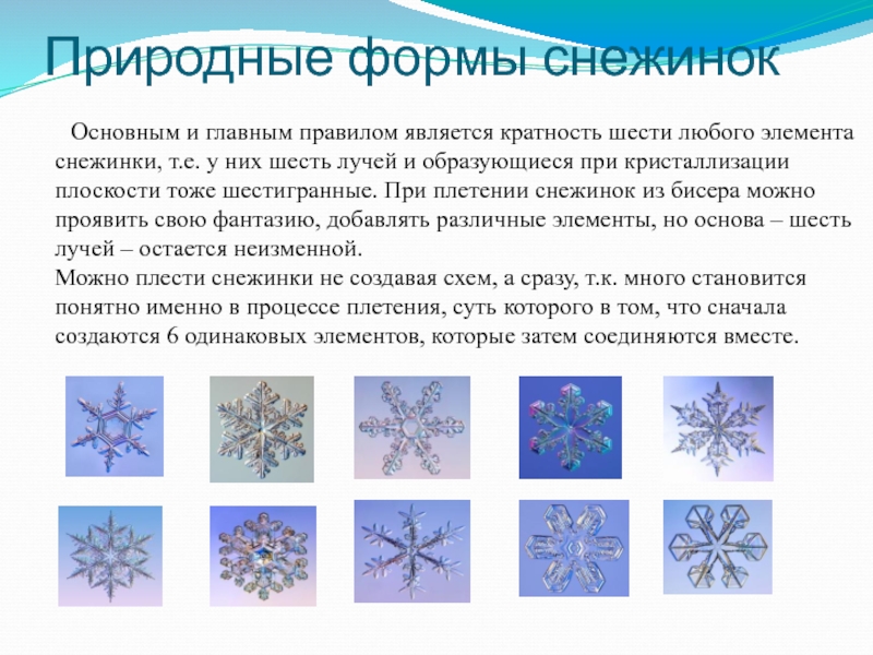 Природные формы снежинок       Основным и главным правилом является кратность шести любого