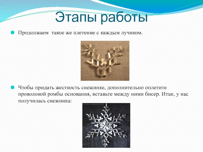 Этапы работыПродолжаем такое же плетение с каждым лучиком. Чтобы придать жесткость снежинке, дополнительно оплетите проволокой ромбы основания,