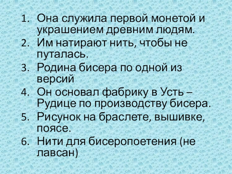 Она служила первой монетой и украшением древним людям.Им натирают нить, чтобы не путалась.Родина бисера по одной из версийОн основал фабрику в Усть – Рудице по производству бисера.Рисунок на браслете, вышивке, поясе.Нити для бисеропоетения (не лавсан)