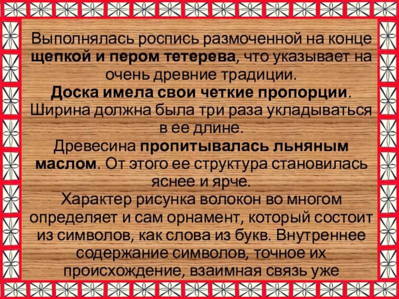 Слайд 29Выполнялась роспись размоченной на конце щепкой и пером тетерева, что указывает на очень