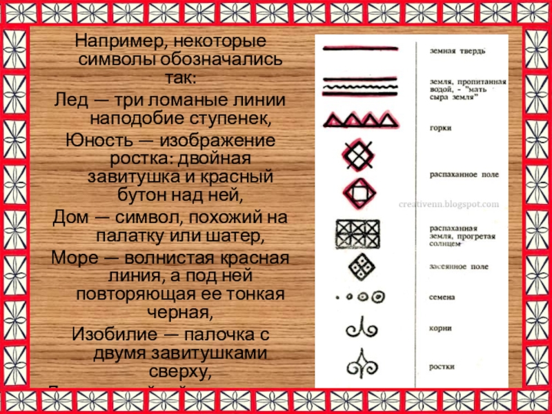 Характер рисунка волокон во многом определяет и сам орнамент, который состоит из символов, как слова из букв. Внутреннее содержание символов, точное их происхождение, взаимная связь уже практически утрачены.