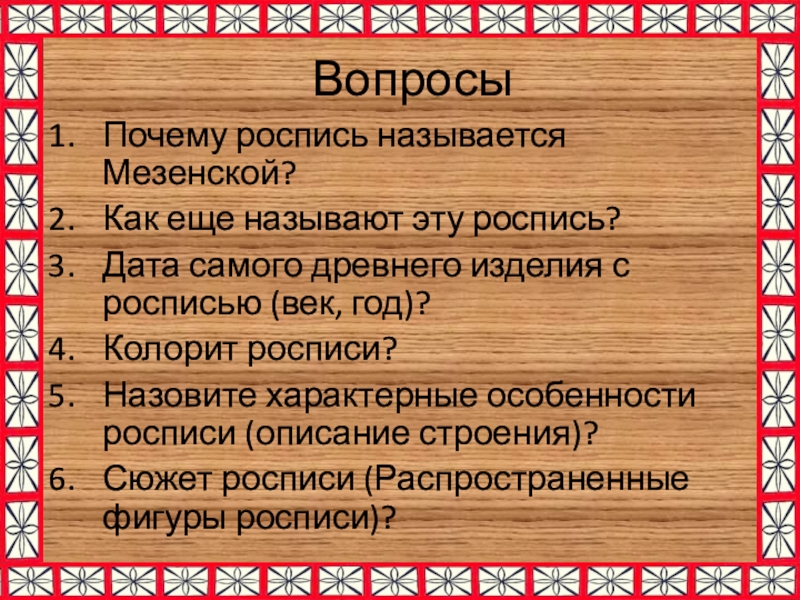 1.Мезенской эту роспись назвали потому, что ее родиной считается