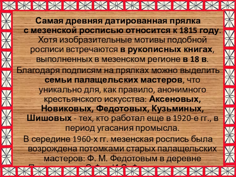 Слайд 8Самая древняя датированная прялка с мезенской росписью относится к 1815 году. Хотя изобразительные