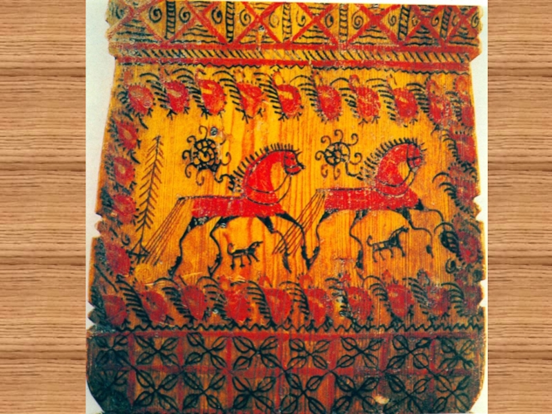 Слайд 18Среди орнаментов — фризы со стилизованными схематичными изображениями коней и оленей, которые