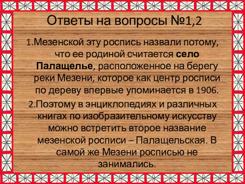 2.Поэтому в энциклопедиях и различных книгах по изобразительному искусству можно встретить второе название мезенской росписи – Палащельская. В самой же Мезени росписью не занимались.