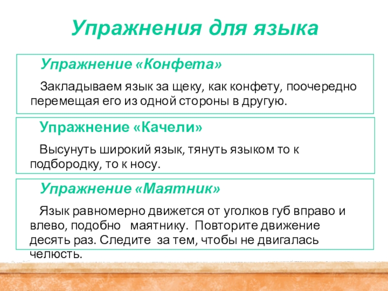 Язык равномерно движется от уголков губ вправо и влево, подобно маятнику. Повторите движение десять раз. Следите за тем, чтобы не двигалась челюсть.